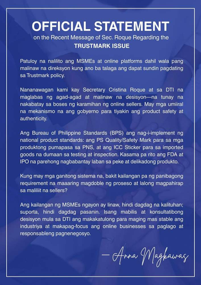 Online Negosyo emphasizes its full support for consumer protection and the fight against online scams. However, the community stresses that the current Trustmark proposal is redundant, duplicative, and risks becoming burdensome if made mandatory.